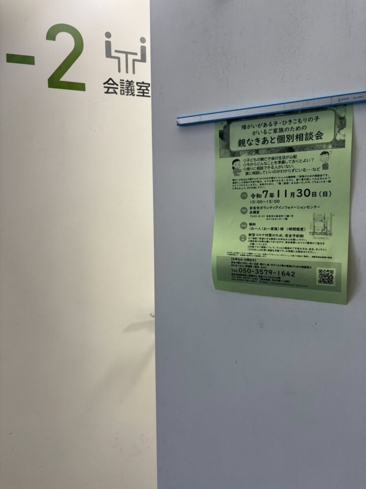 親なきあと個別相談会開催中です 2025.11.30 日々のこと 本日は朝から「親なきあと個別相談会」を開催中です。 朝のご相談が全て終了、皆様ありがとうございました。 午後からのご相談もお待ちしています! (相談は事前予約制、本日の相談会のご予約受付は終了しています。 個別相談希望の方は、本日以外の日で ご予約随時調整しておりますのでお気軽にお問い合わせください。) #親なきあと相談窓口 #わたしがいなくなってもあなたが笑顔でまいにちをすごせるように #悩みをかかえ孤立する方やご家族をなくしたい #奈良