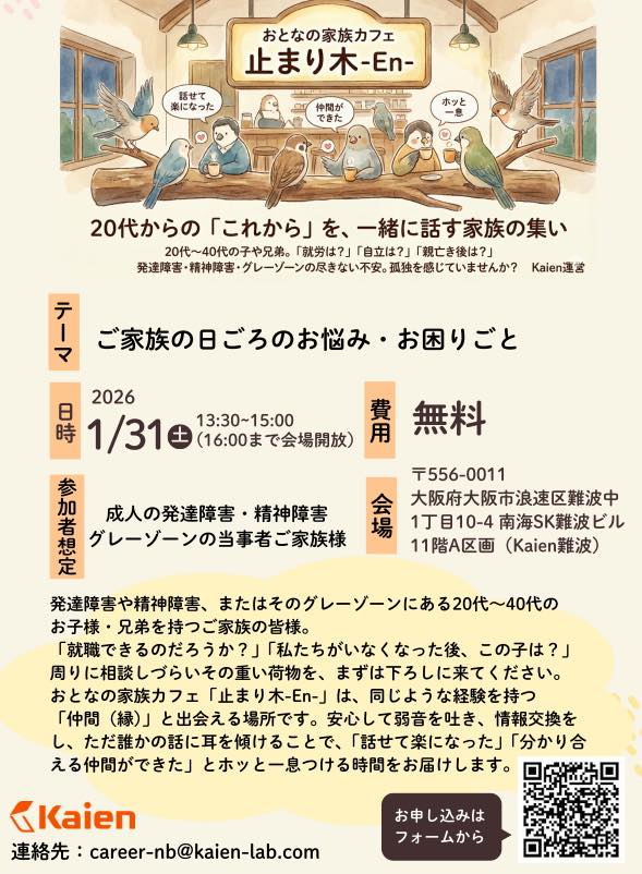 大阪市内、「難波の駅すぐそば」という好アクセスの場所で開催される、ご家族のための居場所の情報をいただきました