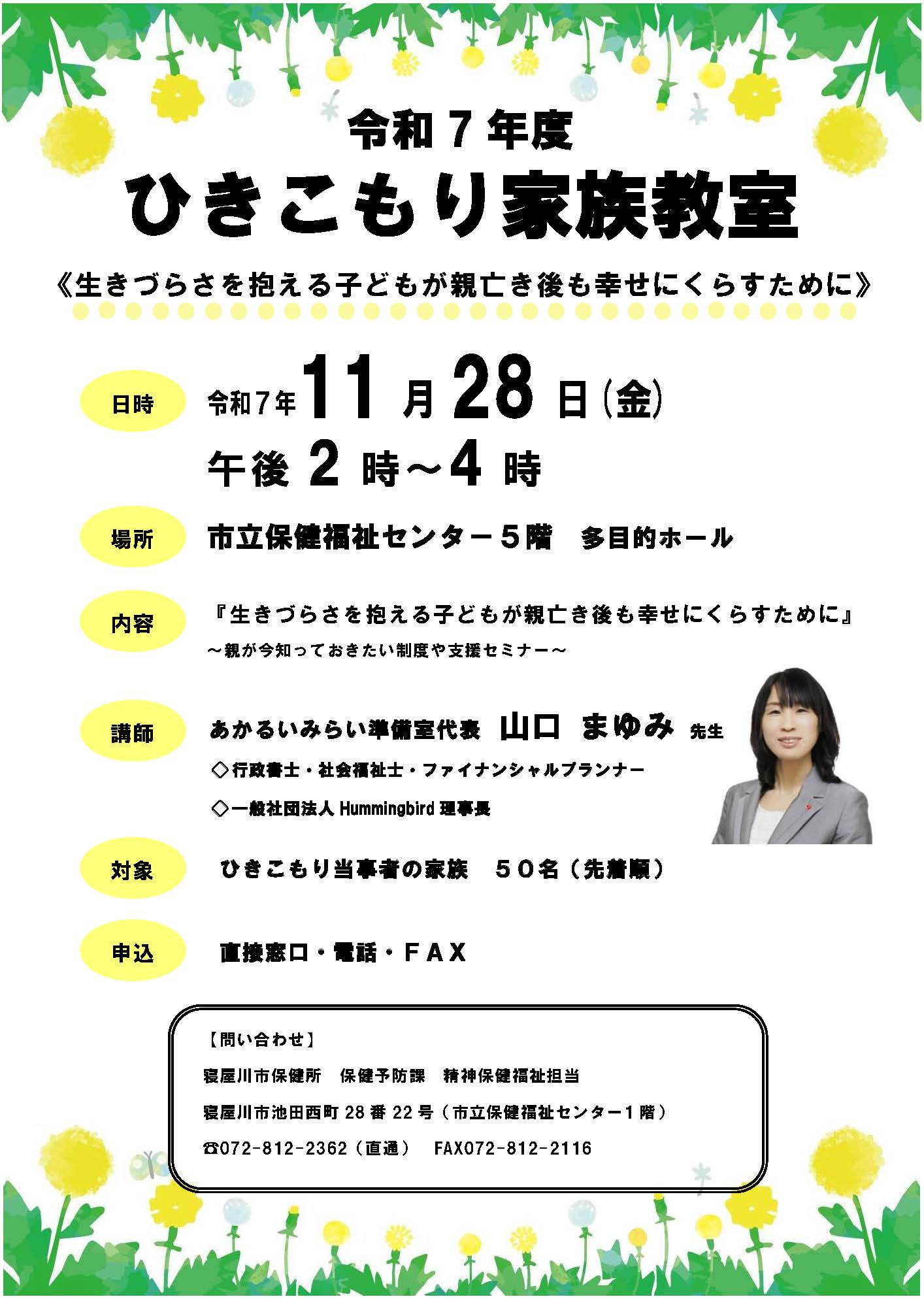 【終了】11/28 『令和7年度ひきこもり家族教室(寝屋川市保健所保健予防課精神保健福祉担当様主催)』開催のお知らせ