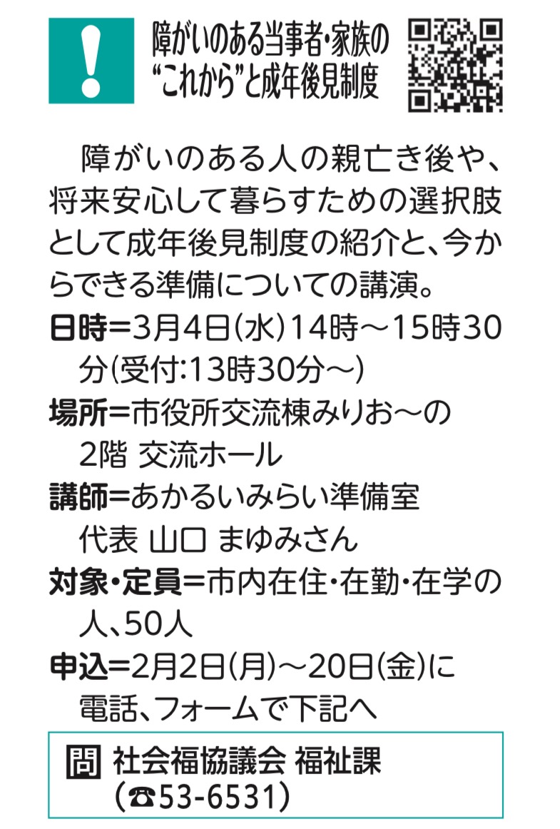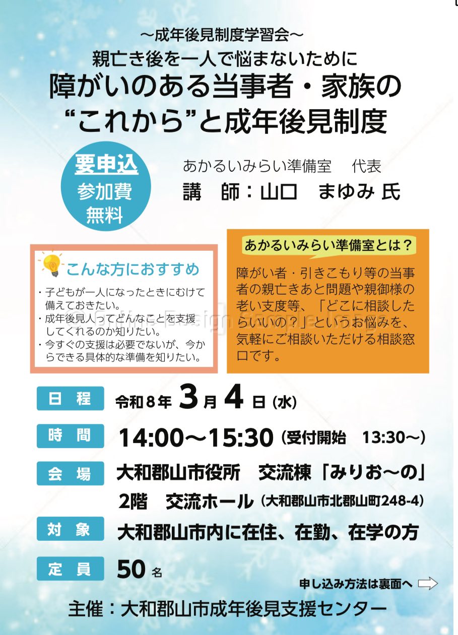【NEW!】3/4『~成年後見制度学習会~親亡き後を一人で悩まないために 障がいのある当事者・家族の”これから”と成年後見制度』(主催:大和郡山市成年後見支援センター)開催のお知らせ