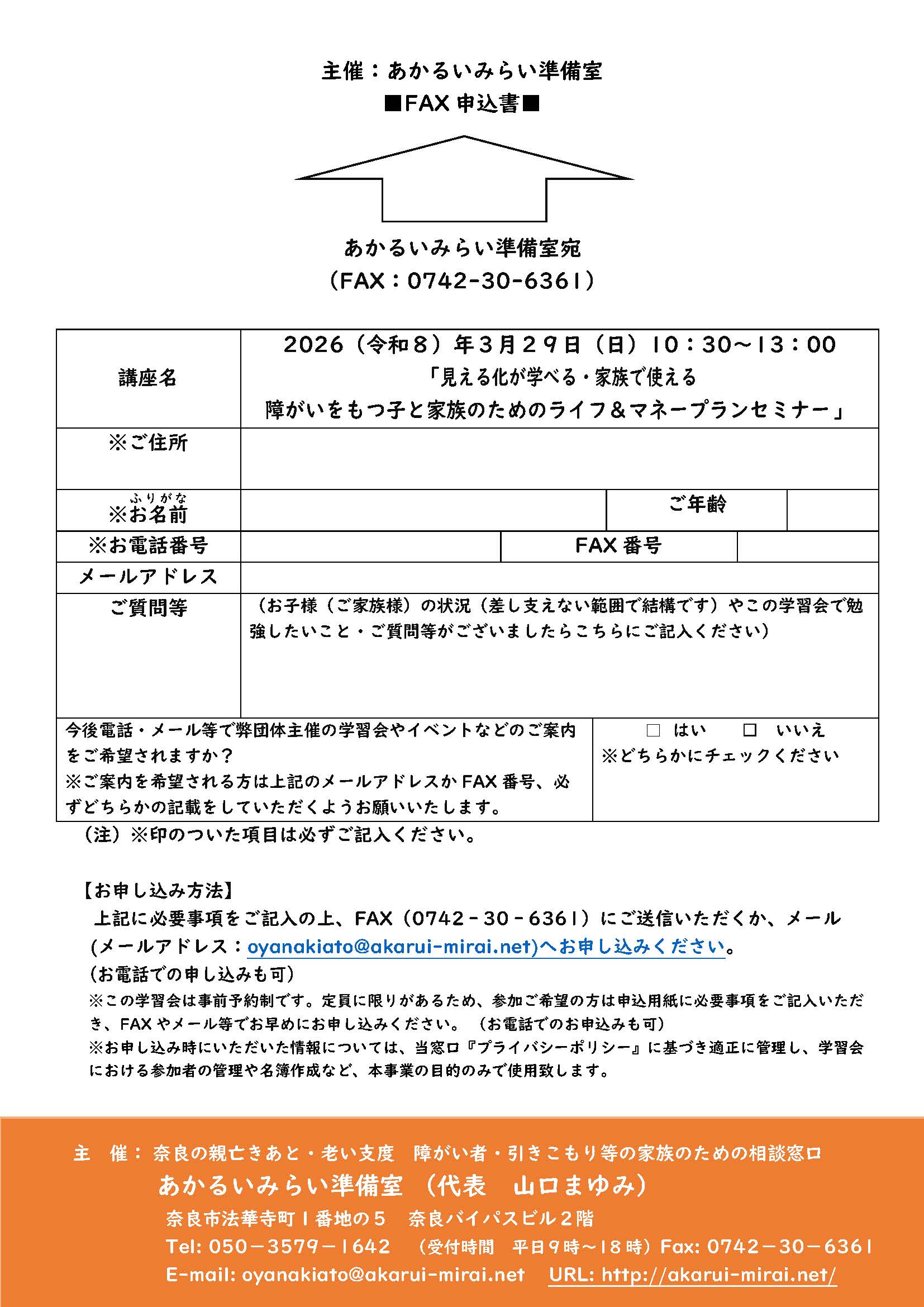 【NEW!】2/8積雪のため延期→3/29『見える化が学べる・家族で使える 障がいをもつ子と家族の為のライフ&マネープランセミナー【オンライン対応も可】』開催のお知らせ