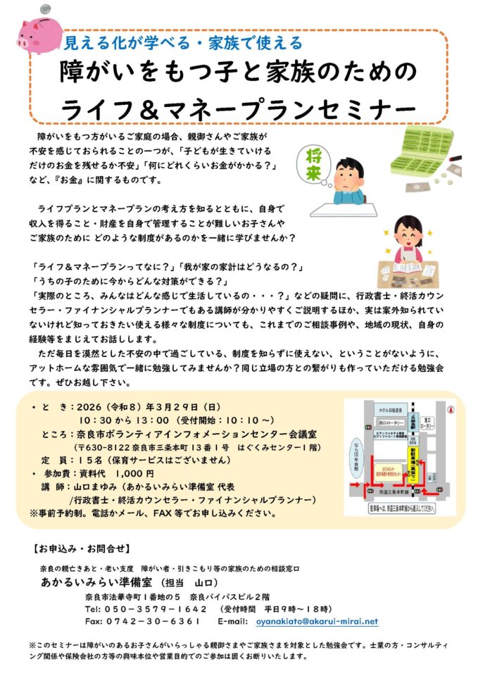 障がいをもつ子と家族の為のライフ&マネープランセミナー』 を開催いたします。