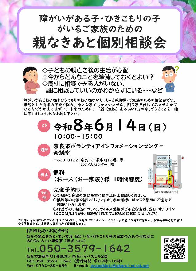 【NEW!】6/14障がいがある子・ひきこもりの子 がいるご家族のための 親なきあと個別相談会【オンライン対応も可】』開催のお知らせ
