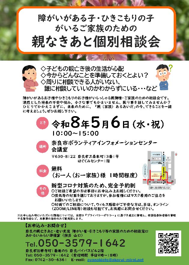 【NEW!】R8/5/9障がいがある子・ひきこもりの子 がいるご家族のための 親なきあと個別相談会【オンライン対応も可】』開催のお知らせ