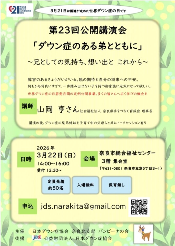 3/22開催 JDS奈良北支部・バンビーナの会『第23回公開講演会 ダウン症のある弟とともに~兄としての気持ち、想い出と これから~』